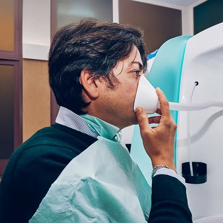 Il paziente si pone a bocca aperta, a circa 30 cm dal bocchettone e respira lentamente e profondamente inalando il vapore termale.